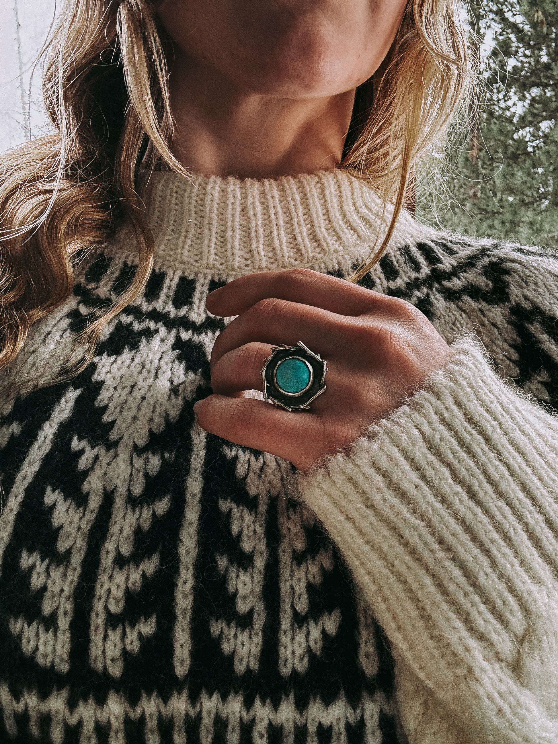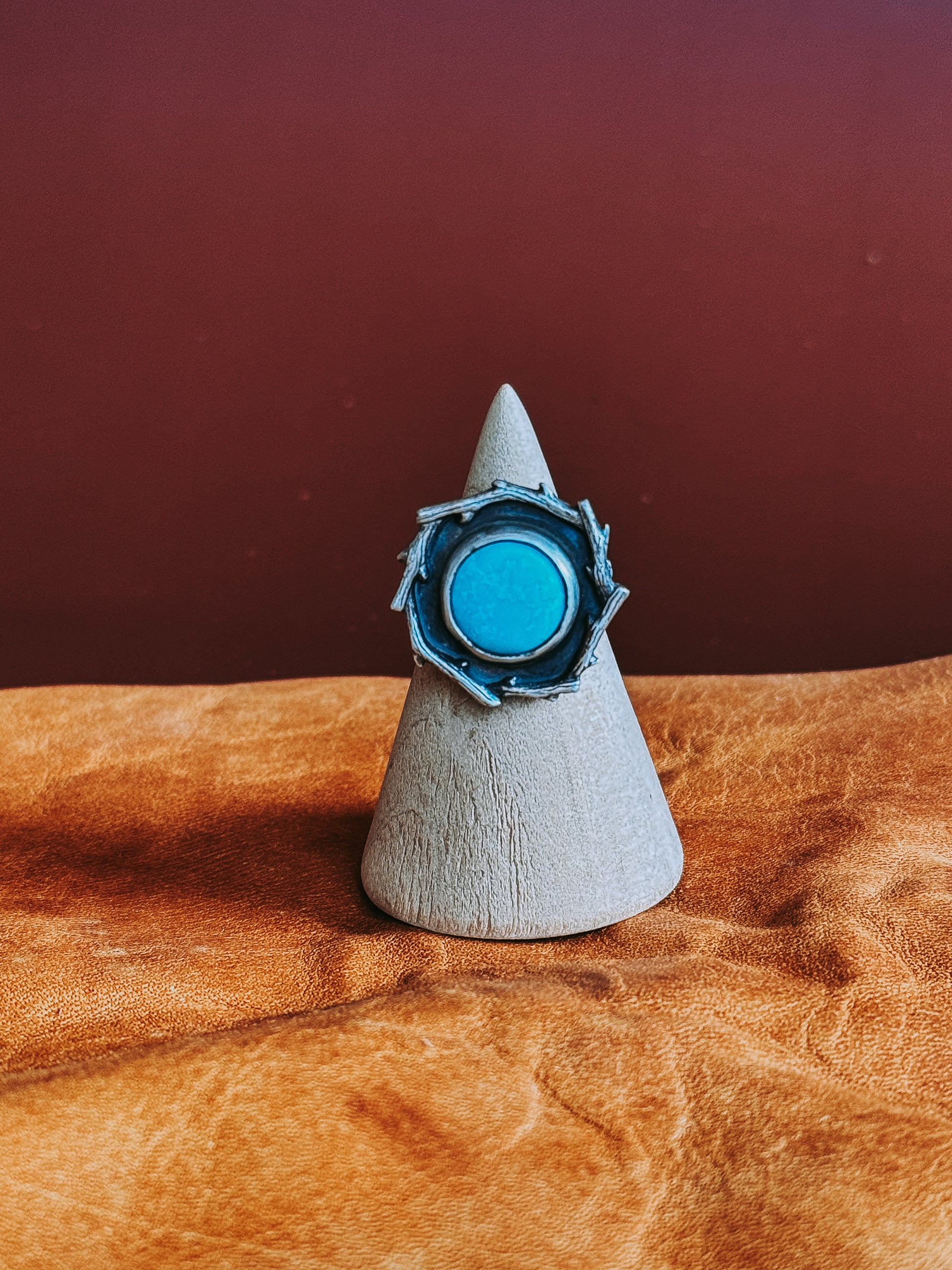 Turquoise set in .925 sterling Silver with w matte patina finish.